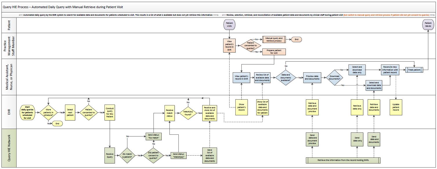 This map shows a process where the provider's EHR automatically queries the Query HIE Network in the morning to gather information on patients scheduled to visit that day. The provider subsequently manually retrieves and reconciles the data obtained via Query HIE at the start of the patient visit. For patients who did not yet provide consent to query, the staff can use the manual query process listed above. |
