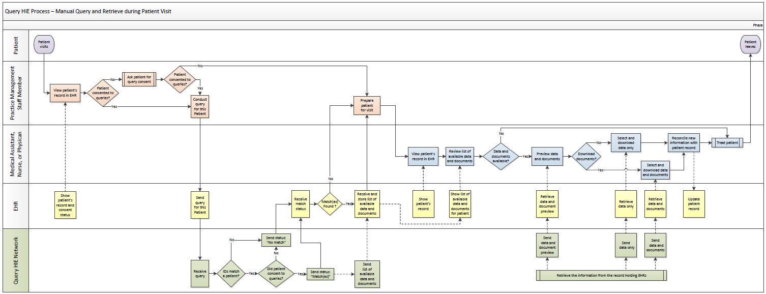 This map represents a process where the provider's practice management staff manually queries the Query HIE network for information on the patient. The provider subsequently manually retrieves and reconciles the data obtained via Query HIE at the start of the patient visit. |