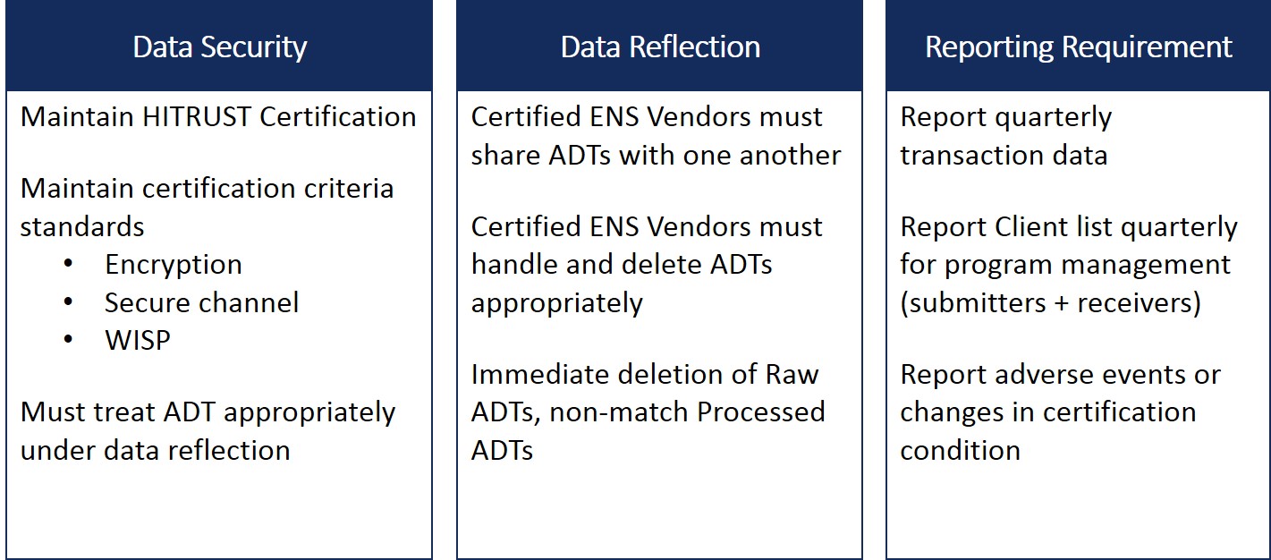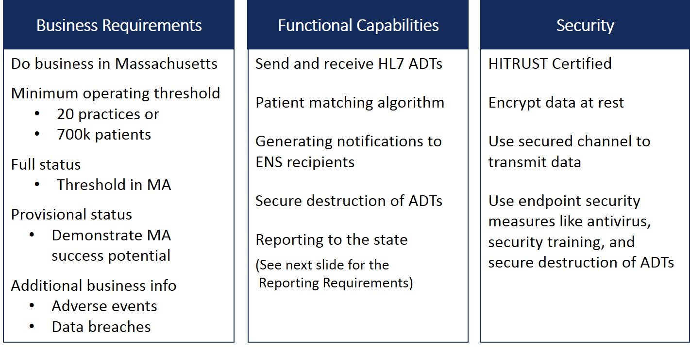 ENS vendors who apply will be certified by the Mass HIway to meet specific functional, data security, data sharing, and business criteria focused on ensuring statewide ENS access, delivery, reliability, and integrity. In a nutshell, to be eligible to be certified, ENS vendors have to meet the requirements shown in the graphic below.