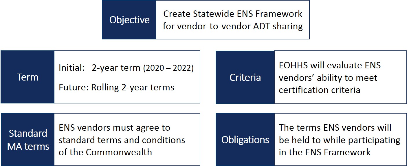 To become certified, ENS vendors must agree to share incoming ADT alerts from Acute Care Hospitals with all other Certified ENS Vendors by interconnecting their ENS systems to exchange the alerts. The vendor also has to agree to the Commonwealth's standard terms and conditions. This creates obligations to which the vendor will be held accountable while participating in the Statewide ENS Framework.