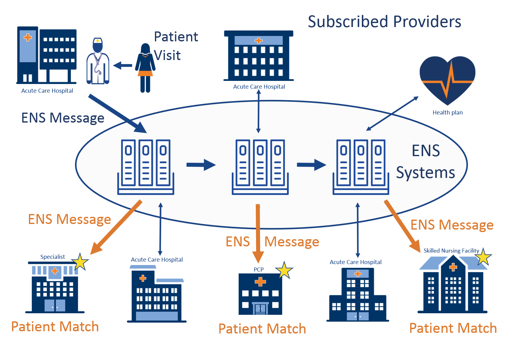 When a hospital, Emergency Department, or post-acute care facility participates in ENS, their admissions, discharges, and transfers of patients trigger ADT alerts to the ENS system. Upon receipt of an alert, the ENS system runs through a patient-provider matching algorithm that locates the subscribed providers with an existing care relationship with the same patient.